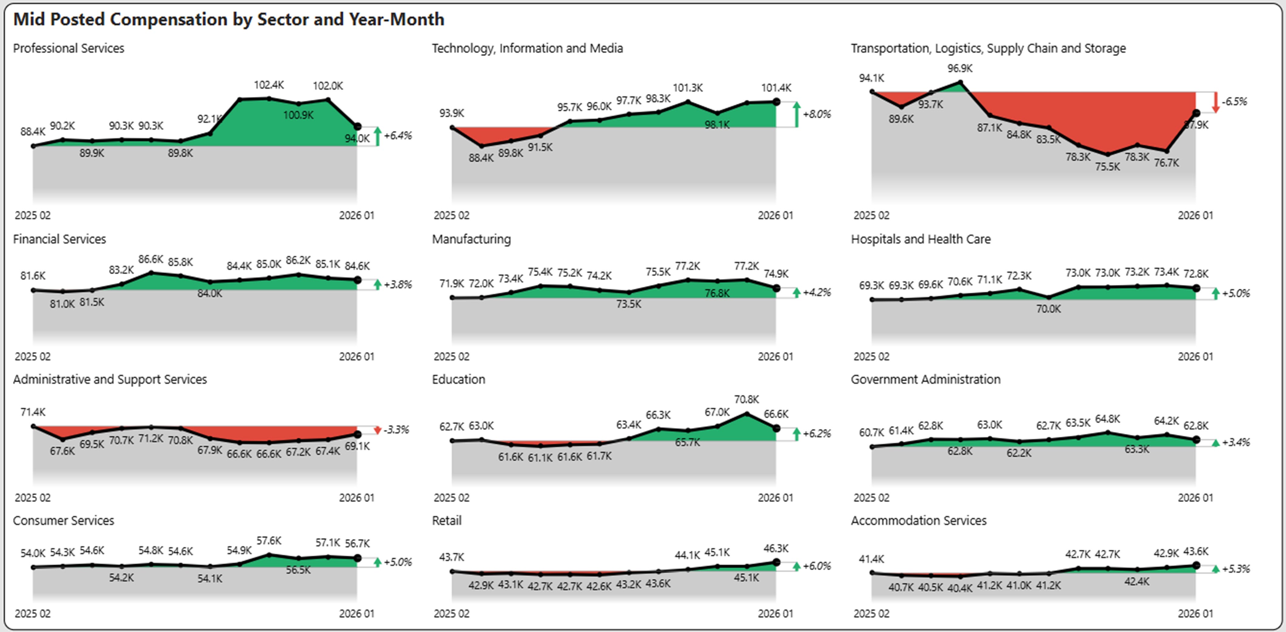 The chart below shows the compensation by industry sector for the past 12 months, highlighting the winners and losers.