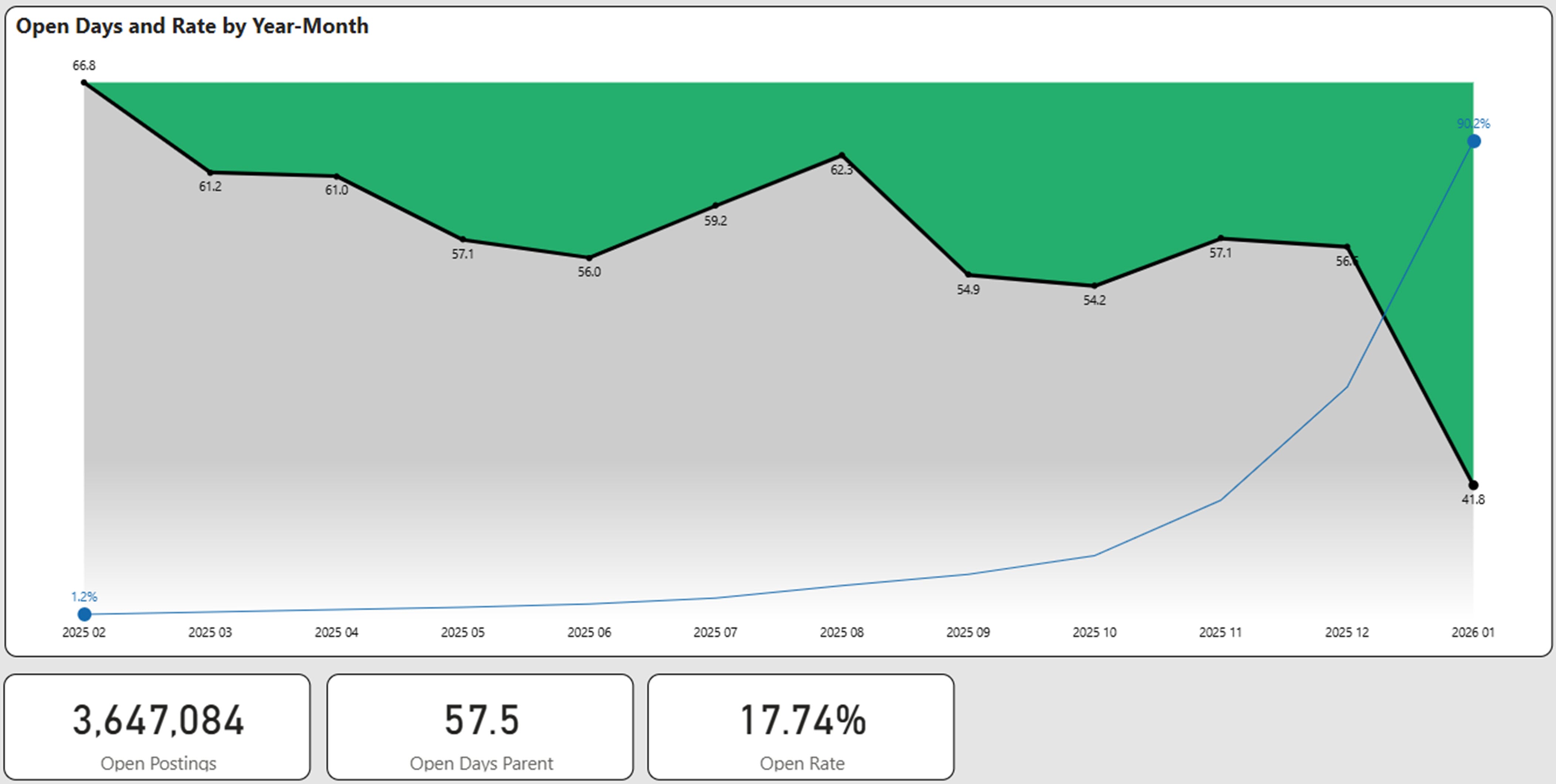 We track every job posting uniquely and ascertain its fill status on a weekly basis. Open days is the average age of postings that are still determined to be open. Generally, we have found that 12 months to be a suitable time period to evaluate the age of open days. Older postings may distort the open days as they may represent “evergreen” postings. For this reason we eliminate implied evergreen ads that are older than one year from our analysis.