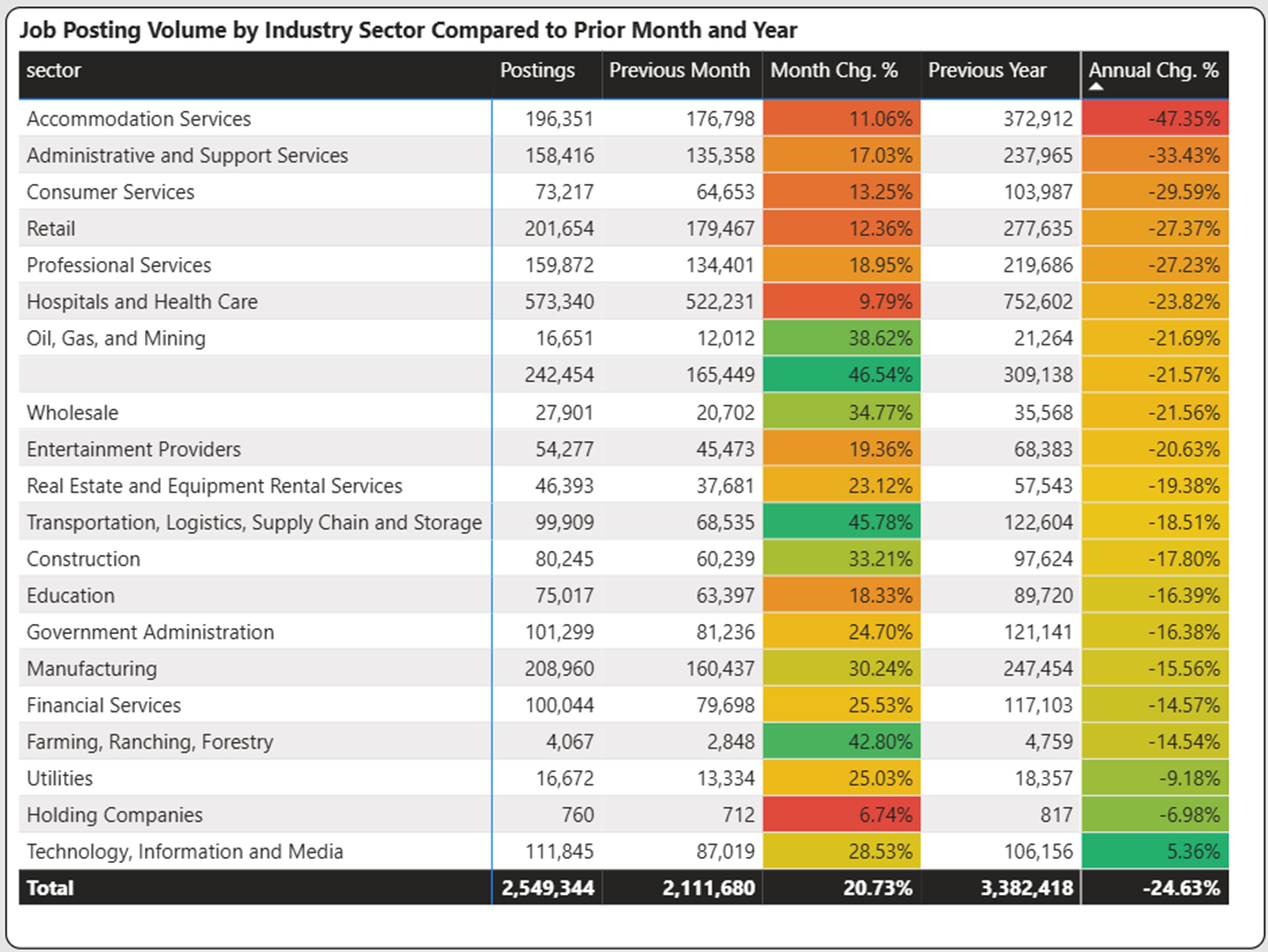 January 2026 job postings declined 24.6% from the same period last year to 2.55 million. The decline was the second largest year-over-year percentage decline in the past twelve months.