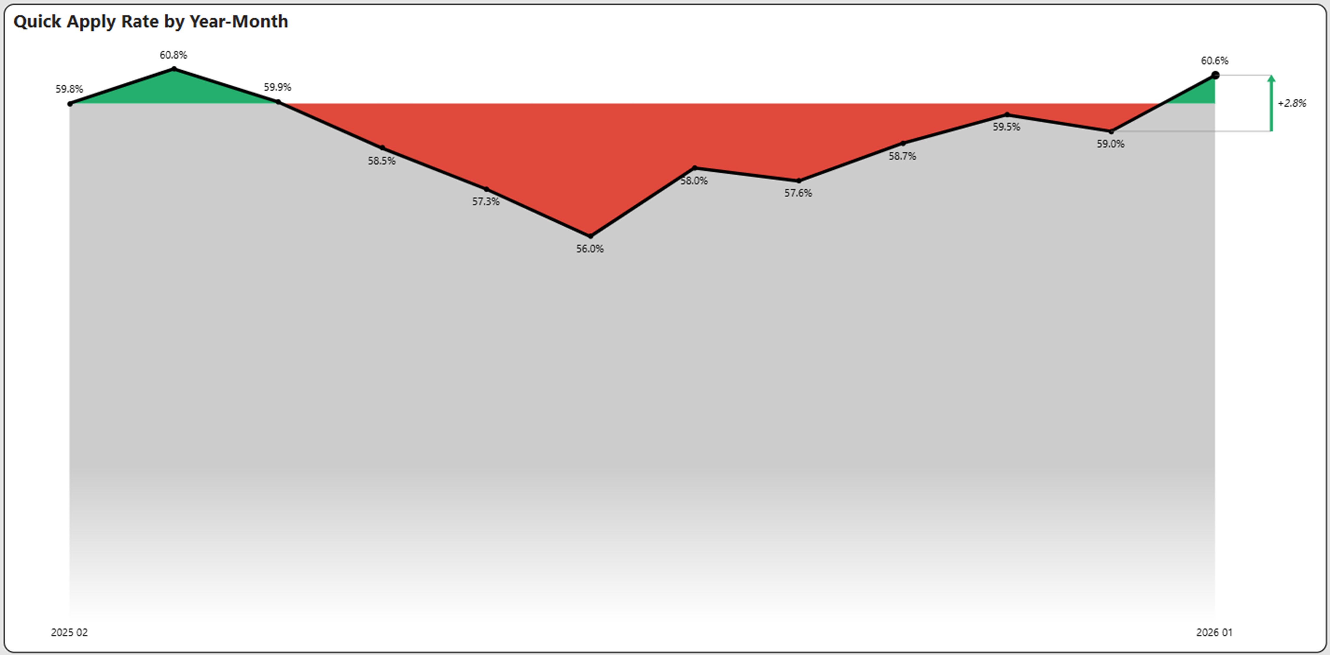 Quick apply rate is an indicator of whether a job posting has the quick apply feature. This rate increased to back above 60% for the first time since March 2025.