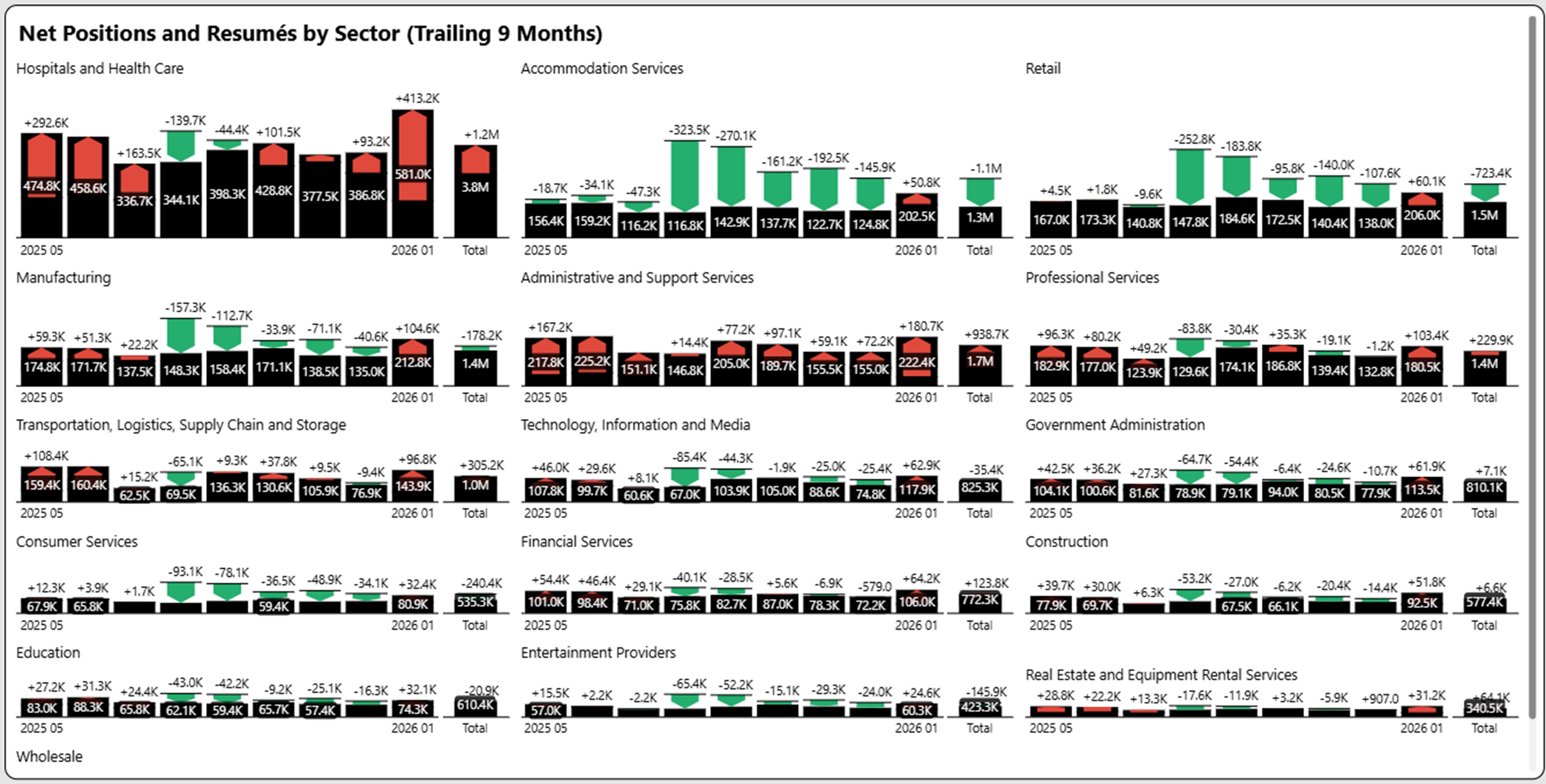 Overall net positions for the trailing nine months decreased from 20.4 million to 19.8 million, the lowest rate in twelve months. Resumes meanwhile are up 10% over the past four months.