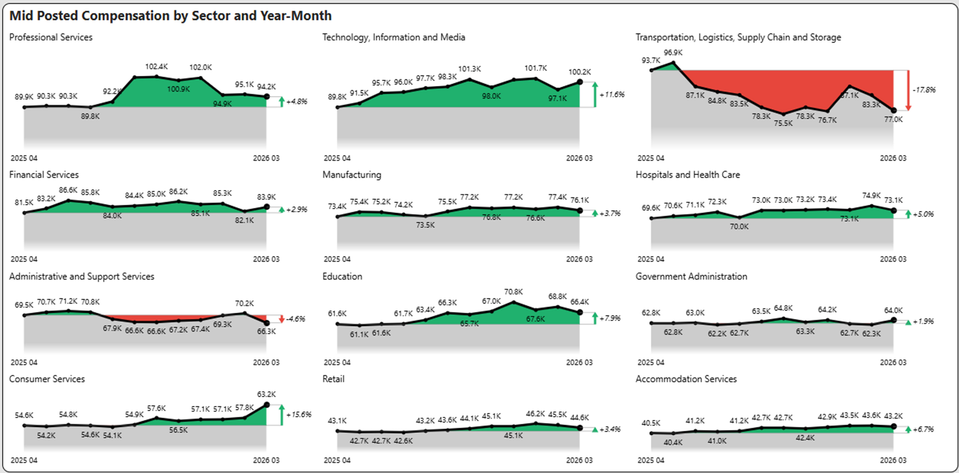 The chart below shows the compensation by industry sector for the past 12 months, highlighting the winners and losers.