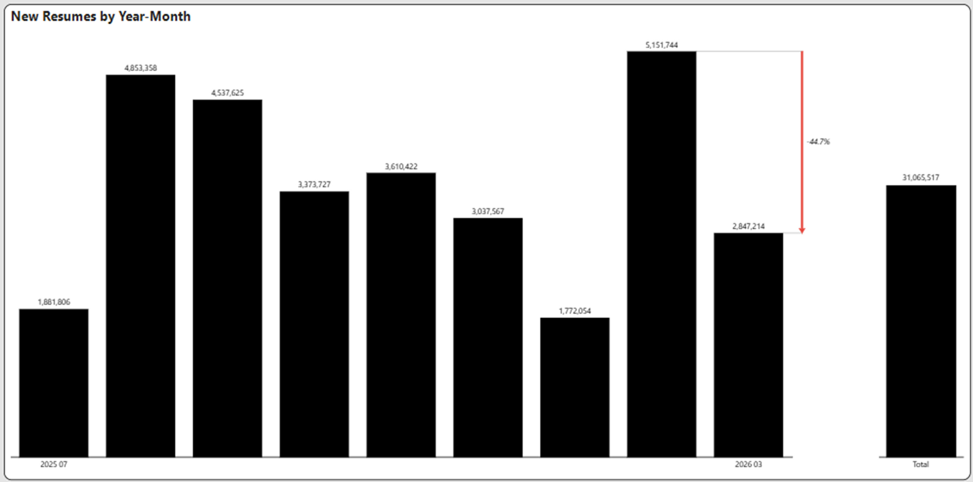 In a month-to-month comparison, total new resumes decreased by 44.7% in March compared to the big spike in February.