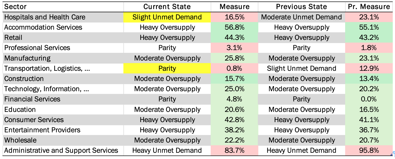Most notably Hospitals and Health Care is approaching parity after many months at a Heavy Unmet Demand state.