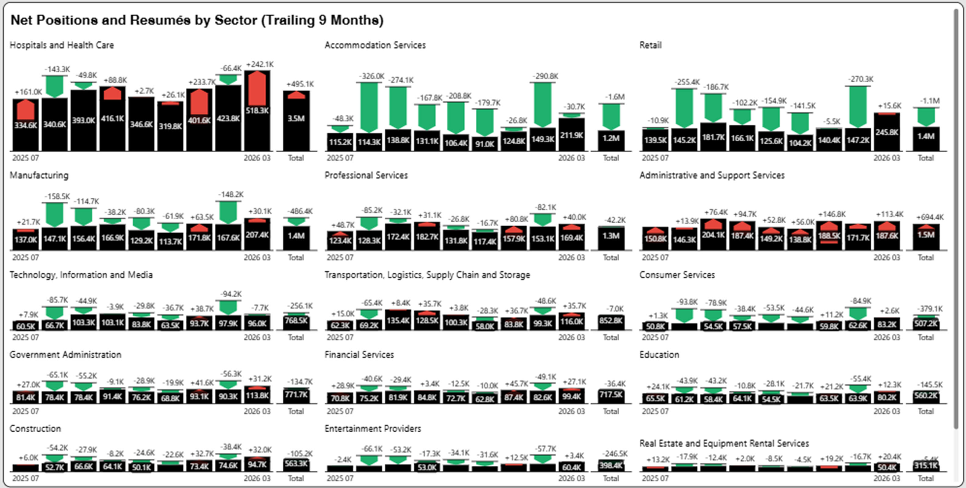 To highlight supply/demand imbalances, we superimpose job seekers based on resumés against net job positions (hires based on unique postings) in black bar. The graphs highlight supply surplus (more job seekers than net postings) shown in green or supply shortage (less job seekers than net postings) shown in red. We picked a time period of nine months, which highlights the current market surplus or shortage. The total bar reflects the summaries of openings and resumés for that time period.