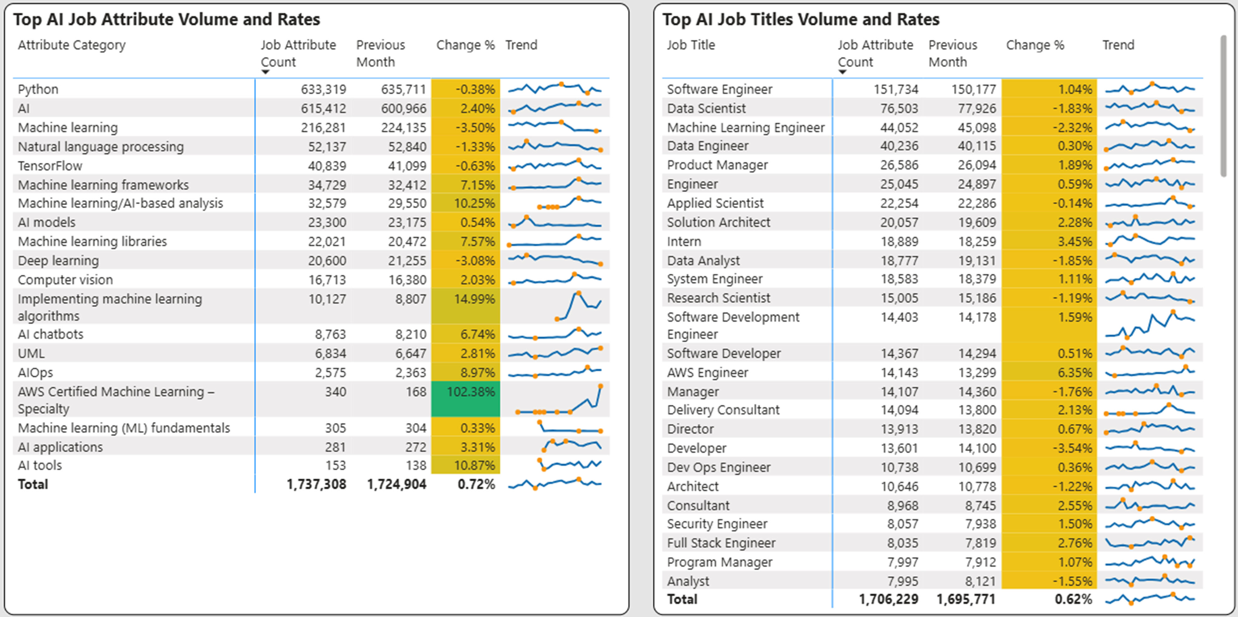 Job attributes are categories of skills, benefits or credentials that are included in a job posting. We have flagged AI related categories and plotted the trailing 19-month (earliest data available) growth as shown below. The top AI skills are shown below along with the corresponding job titles.