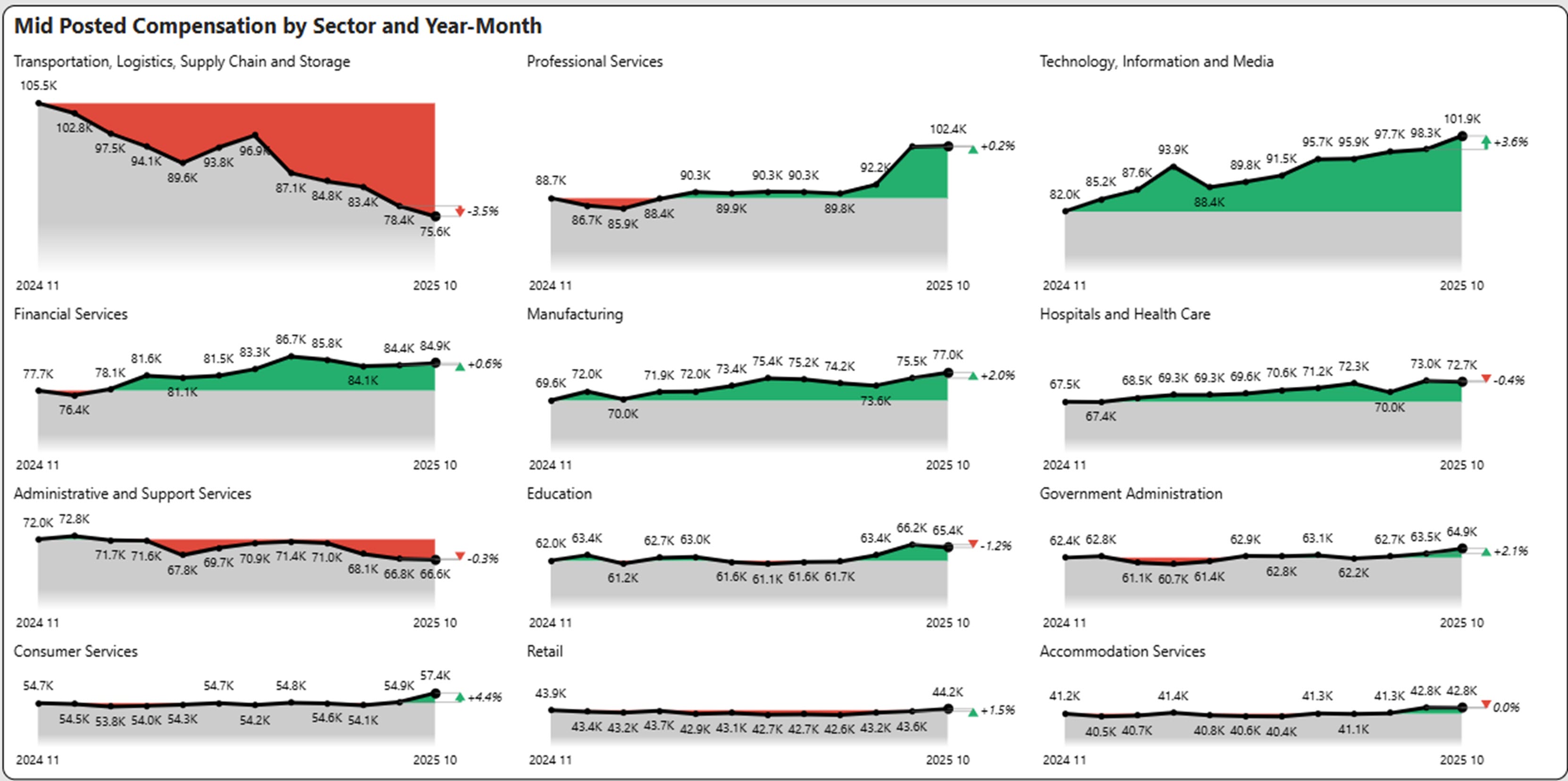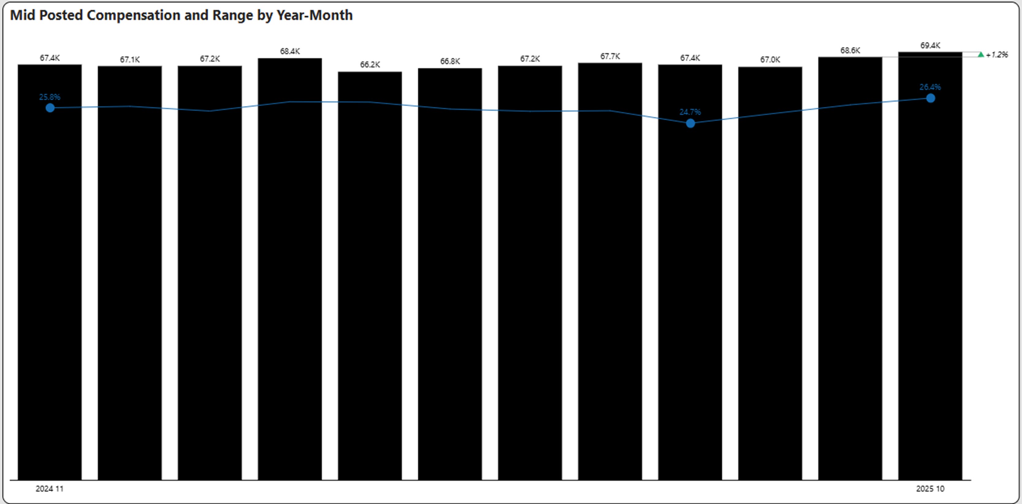 In this October 2025 Jobs Report, we see that Mid-posted compensation increased 1.2% to $69,400, a 12-month high. This continues the meaningful increase from September. In addition, the range of pay between max and min compensation as a percentage of the midpoint also continued to increase from 26.0% to 26.4%, suggesting some flexibility in negotiated pay. This range also is at a 12-month high.