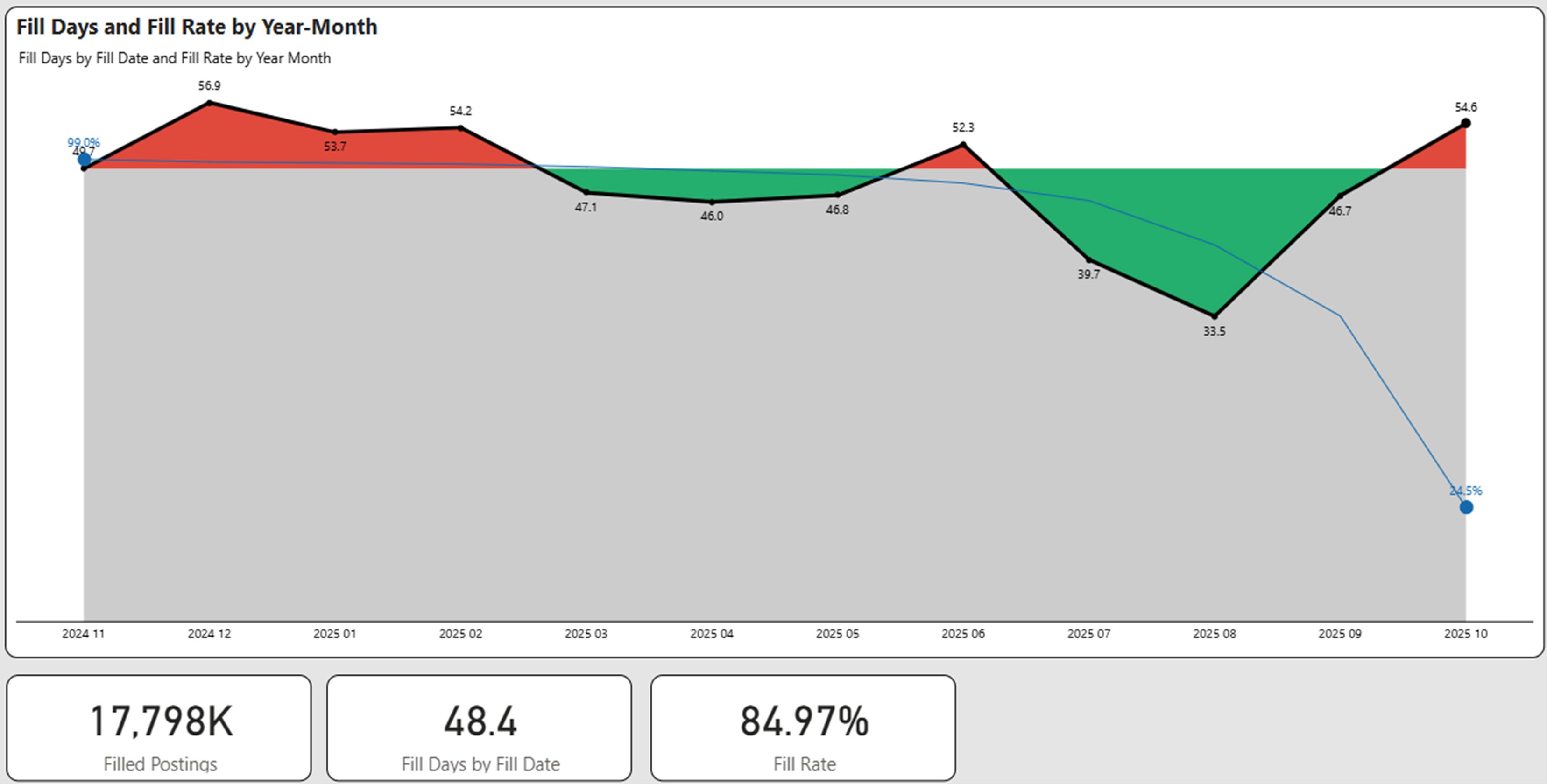 Fill days as a composite over the last 11 months was flat with 48.3 days in September compared to 48.4 days in October. The percentage of ads filled during this timeframe however significantly increased from 81.4% in September to 85.0% in October indicating more success in filling jobs over the time period.