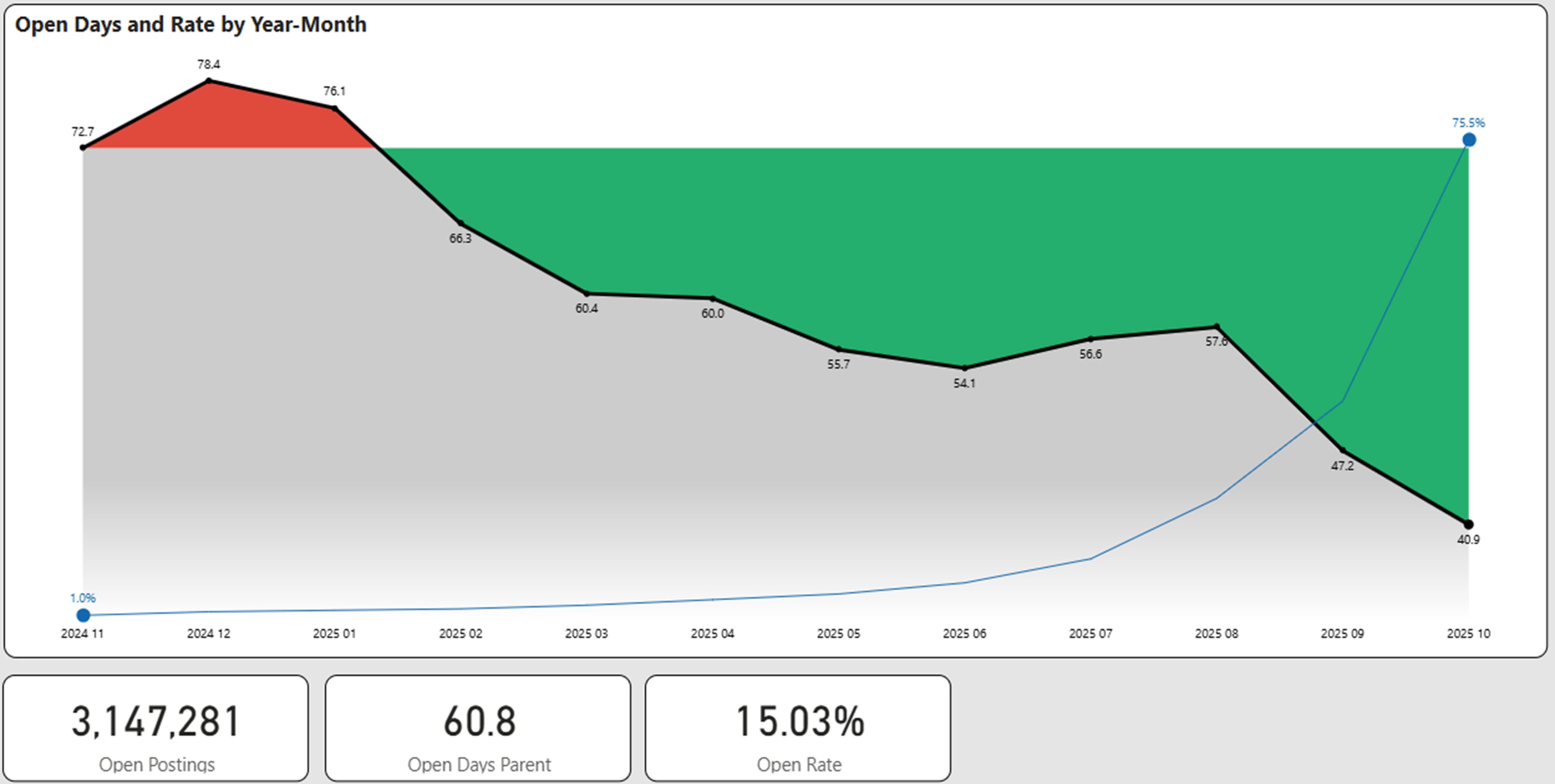 Open days is the age of postings that are still determined to be open. We track every job posting uniquely and determine its fill status on a weekly basis. Generally, we have found 12 months to be a suitable time period to evaluate the age of open days. Older postings may distort the open days as they may represent “evergreen” postings. For this reason we eliminate implied evergreen ads that are older than one year.