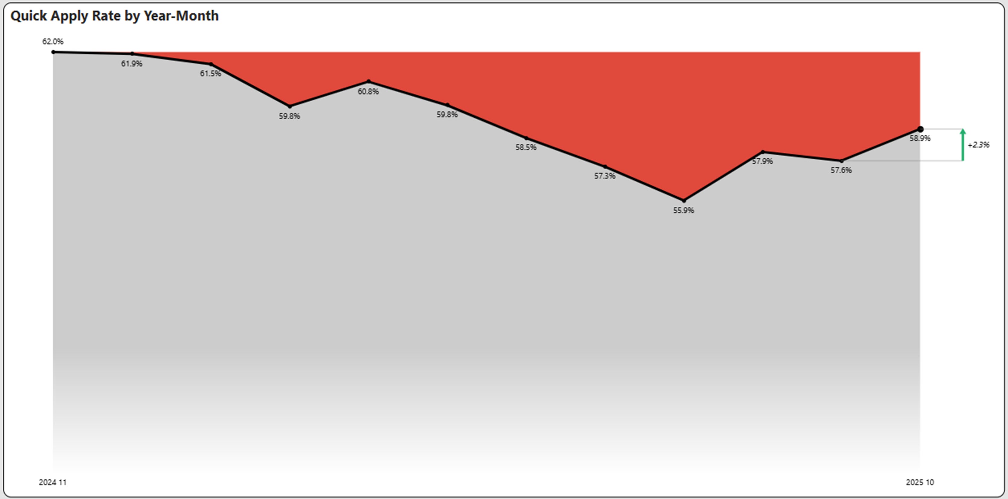 Likewise, quick apply rate is an indicator of whether an advertisement is promoted. It also has shown some improvement in October and at 59% it is now solidly above the annual low.