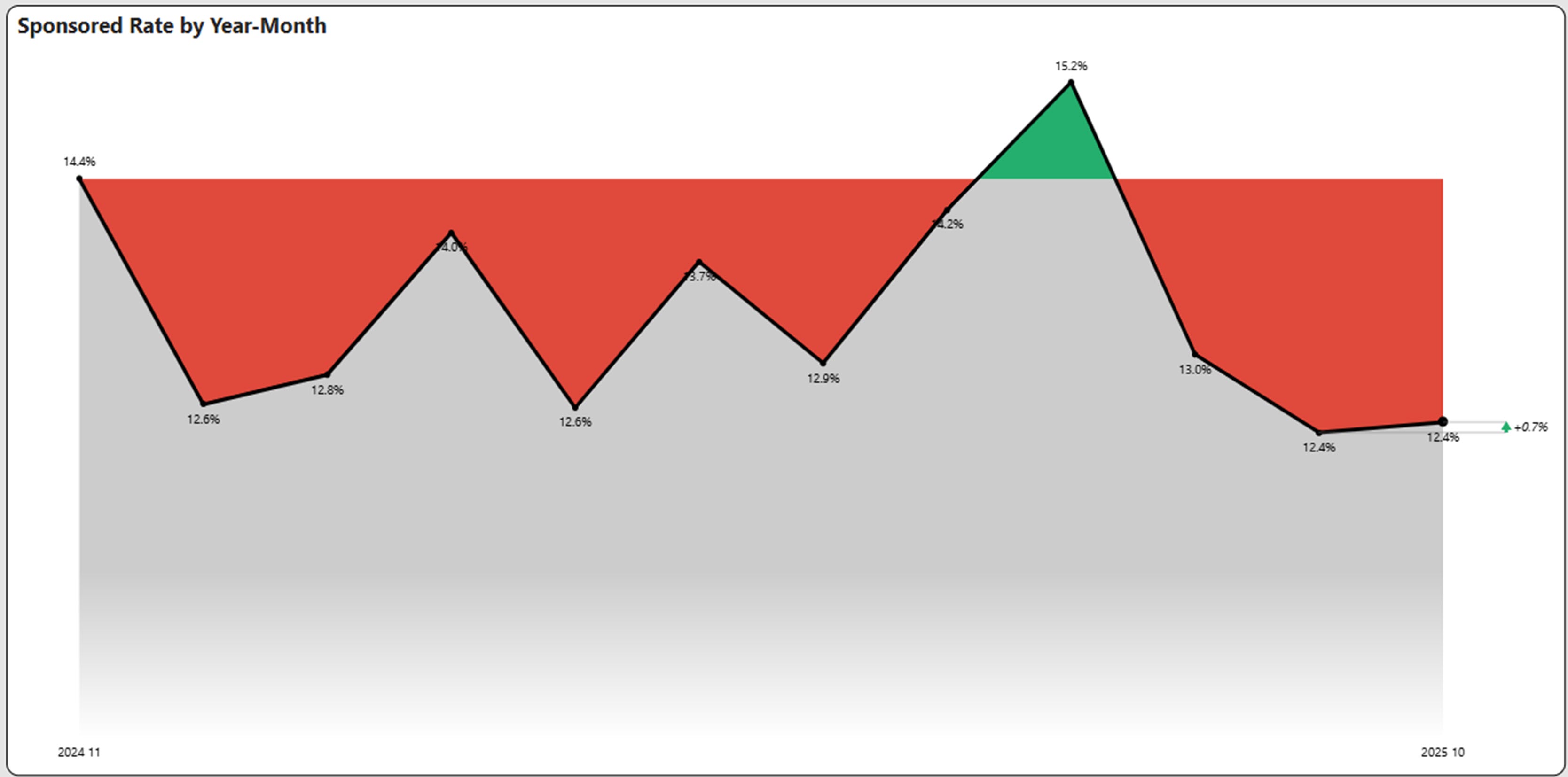Sponsored rate is the percentage of job advertisements with a sponsor indicator. This is a measure of how active the job boards are. Sponsored rates after hitting an annual low rebounded slightly in October to 12.6%.