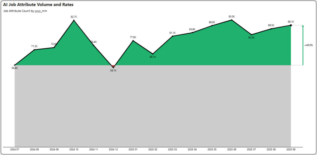 Job attributes are categories of skills or credentials that are assigned to an individual job posting. We have flagged AI related categories and plotted the trailing fifteen-month growth as shown below. AI skills while still a very small percentage of overall jobs show continued growth.