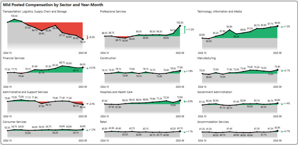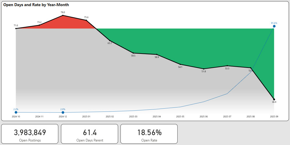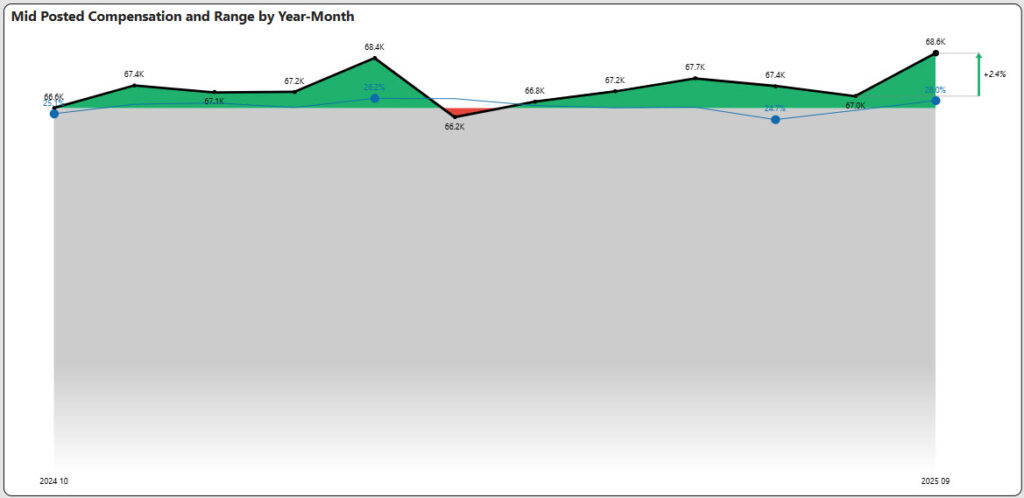 In this September 2025 Jobs Report, we see that mid-posted compensation increased 2.4% to $68,600, a twelve-month high. This is the first meaningful increase in the past six months. In addition, the range of pay between max and min as a percentage of the midpoint increased from 25.3% to 26.0%, suggesting some flexibility in negotiated pay.