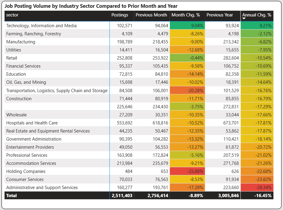 September job postings at 2.51 million declined 16.4% from the same period last year and sequentially 8.9% from August . Postings have declined from the prior year in each month in 2025.