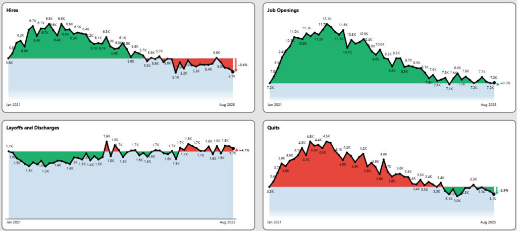 - Layoffs and Discharges declined 3.5% in August and has remained in a tight range since early 2023. Layoffs and Discharges are still well within historical levels.