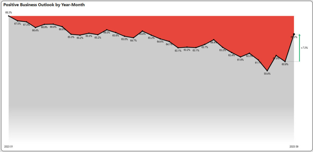 Positive Business Outlook based on Glassdoor reviews finally increased in September after a long downward trend. Both are encouraging signs that worker attitudes are improving.