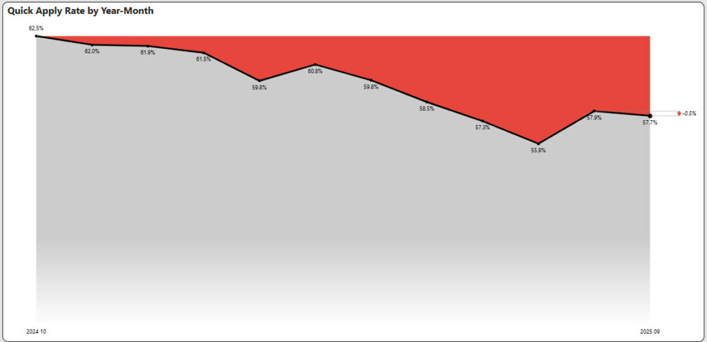 Jobs ads’ Quick Apply Rate stayed flat at 57.7% and marginally higher than the 2025 low of 55.9%.