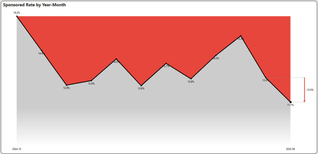 Sponsored rate is the percentage of job advertisements with a sponsor indicator. This is a measure of how active the job boards are. Sponsored rates started out the year above 16% but have now declined to 2025 lows at 11.7%.
